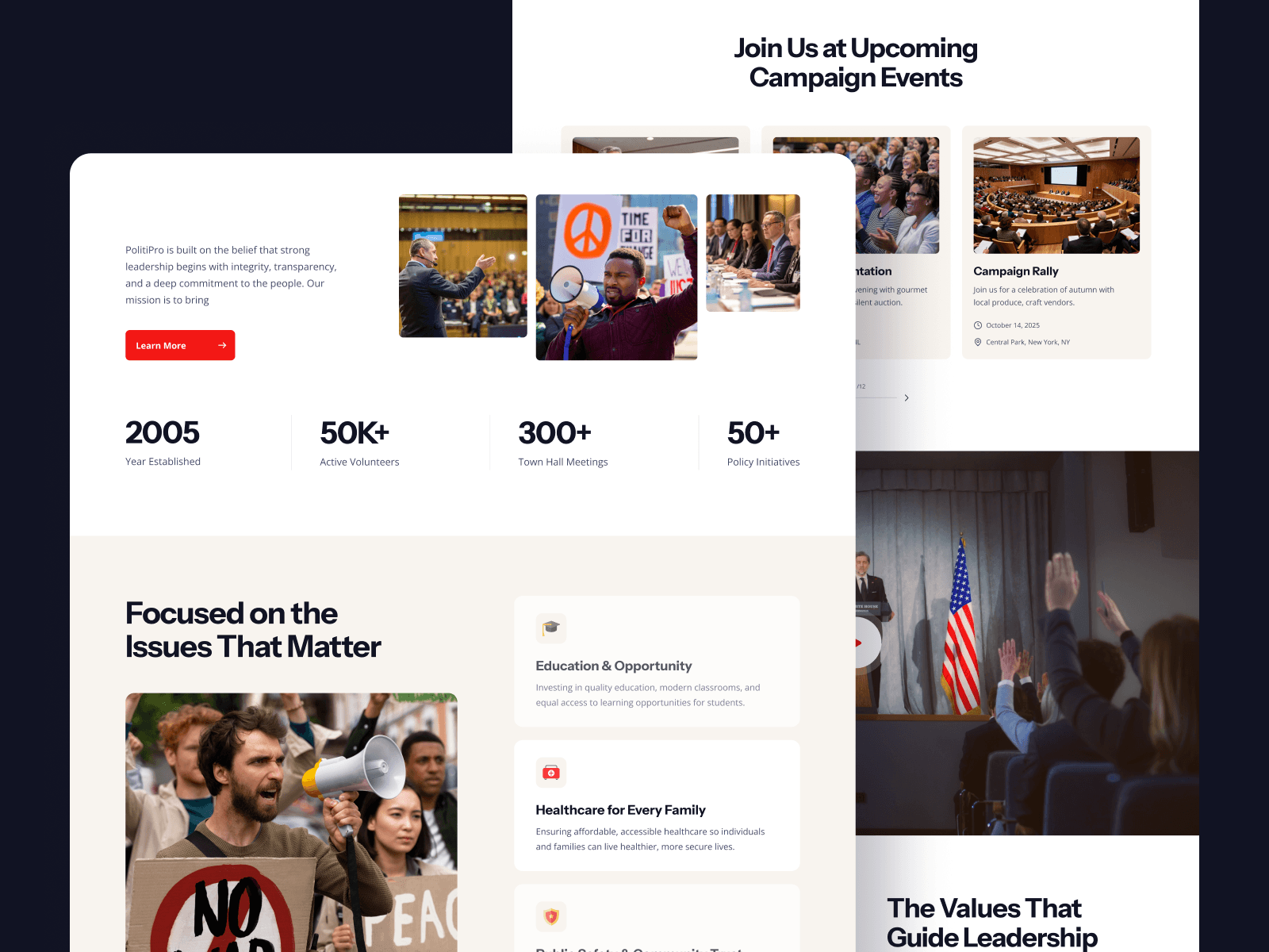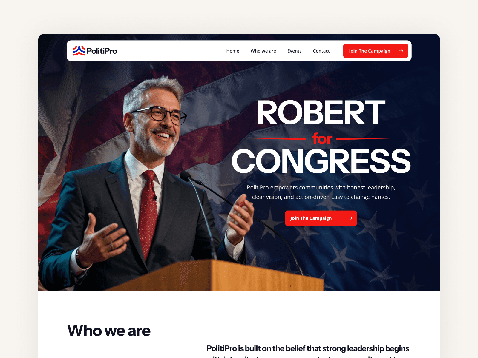 This political website template comes with 16 pages designed specifically for politicians and campaign teams. Share your story, collect donations, manage events, and keep supporters updated with the built-in blog system. Every page is carefully designed to help you build trust and grow your supporter base.