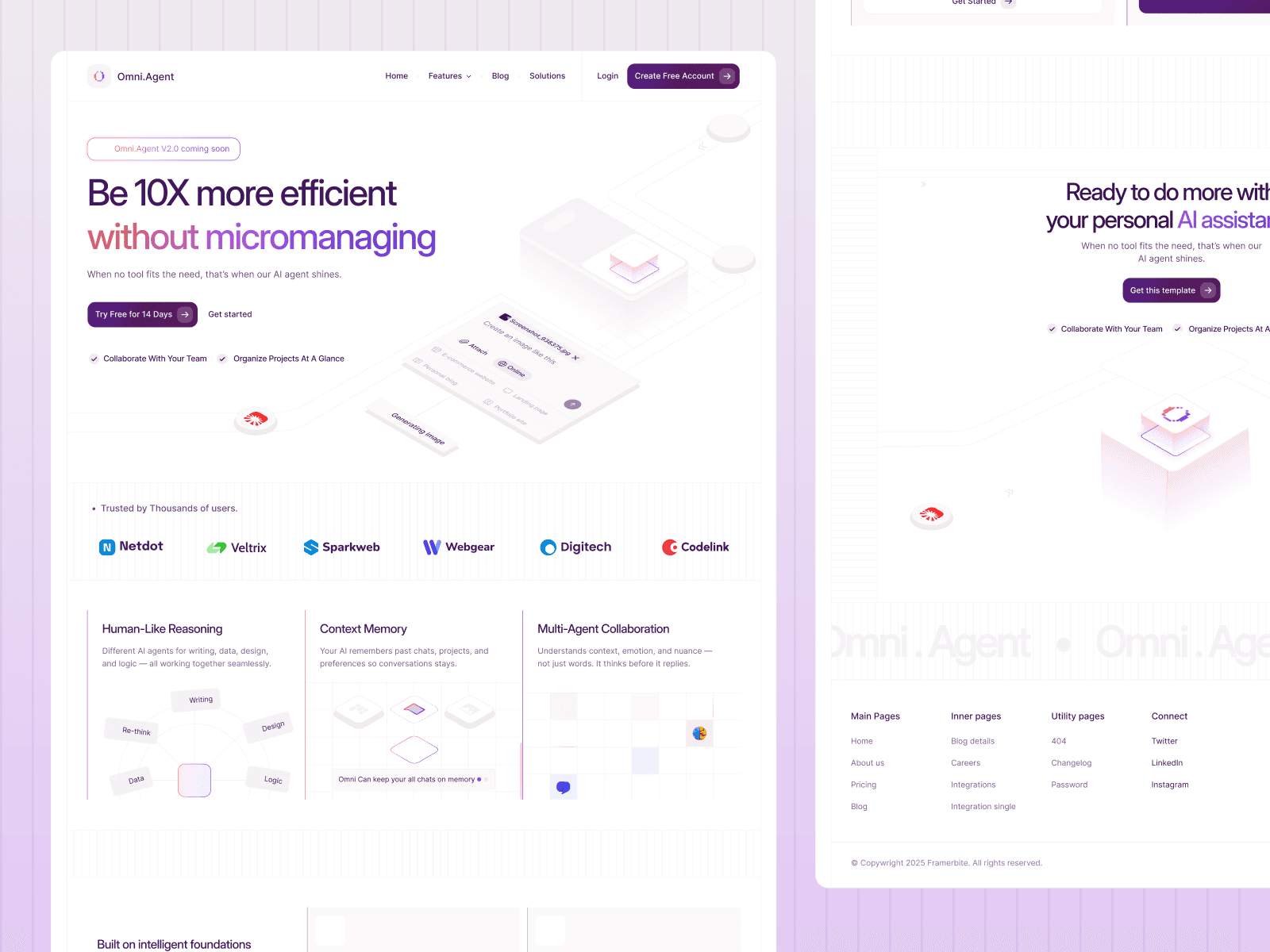 This isn't just another template. Omgent comes with 15 carefully designed pages that cover everything your AI assistant or SaaS platform needs. From showcasing your AI features to converting visitors into paying customers, every page has a purpose.